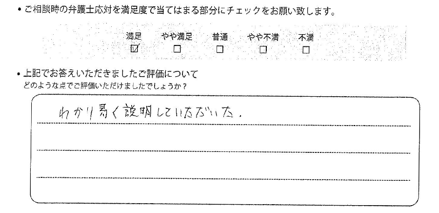 法律の説明、アドバイスなどわかりやすく説明してもらいました。また、手続きの迅速な対応。
